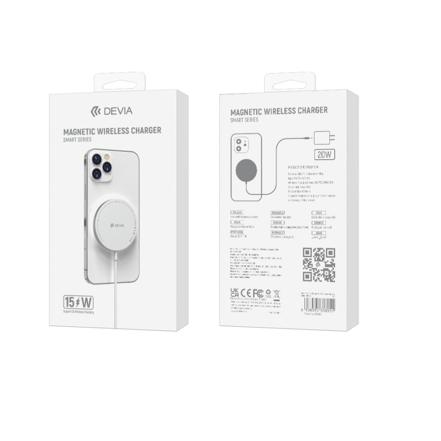 DEVIA Smart je 15W indukčná nabíjačka určená pre zariadenia využívajúce magnetický držiak nabíjačky. Vďaka tomuto riešeniu sa nemusíme báť, či sme smartfón správne umiestnili na nabíjačku. Nabíjačka je kompatibilná aj s inými smartfónmi, ktoré nepoužívajú magnetický držiak, stačí smartfón položiť na ležiacu nabíjačku. Na dosiahnutie najvyššieho výkonu bezdrôtového nabíjania sa odporúča použiť nabíjačky PD 3.0 / PD 2.0 (20 W) alebo QC 2.0 / QC 3.0.